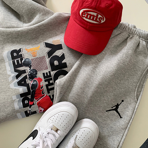 앞은 심플한 레터링으로, 뒤는 마이클조던 실루엣 프린팅으로